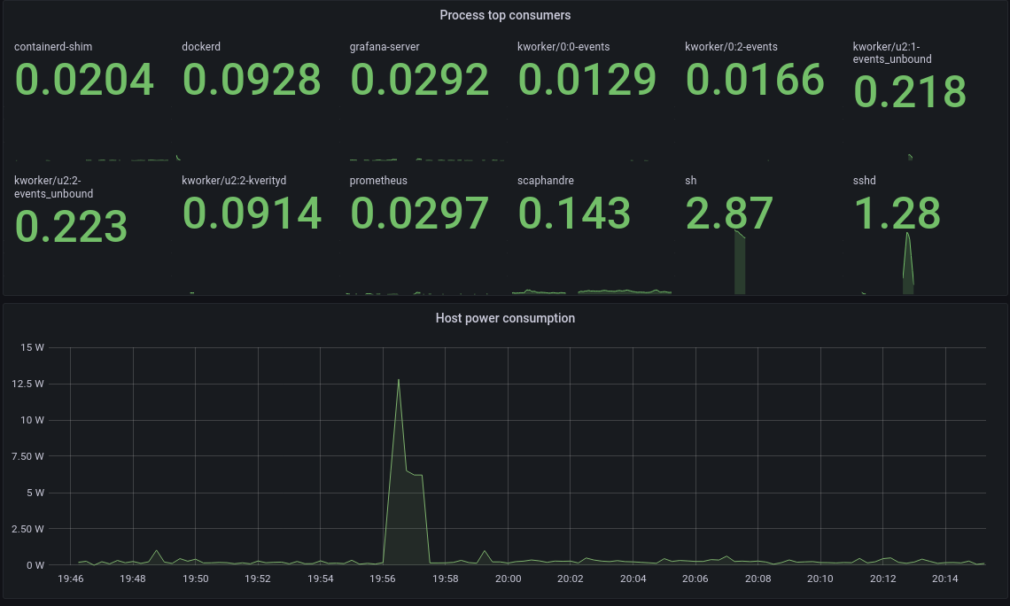 Leaving the kernel to the user space, it’s now possible to use high-level software like Scaphandre to fetch and serve these metrics through various exporters (JSON, stdout, Prometheus, etc.). As seen previously, it’s first required to configure the kernel to build “intel_rapl” driver and “powercap” framework – it has been done for Flatcar in this PR: flatcar/coreos-overlay#1801 and it’s available since the release 3227.0.0.