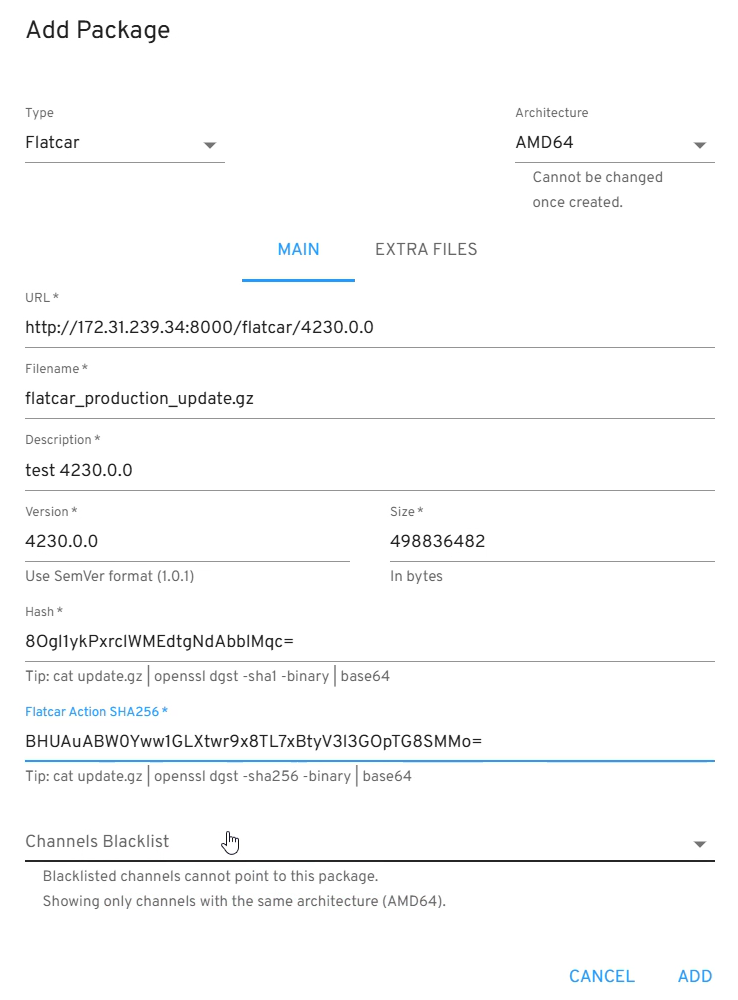 172.31.239.34, and if the dedicated directory to store the packages is/tmp/flatcar/, while the package is in the subdir/tmp/flatcar/4230.0.0, you start nebraska with the following params:-host-flatcar-packages=true,-flatcar-packages-path=/tmp/flatcar, and-nebraska-url=http://172.31.239.34:8000, then the filled form should look like: